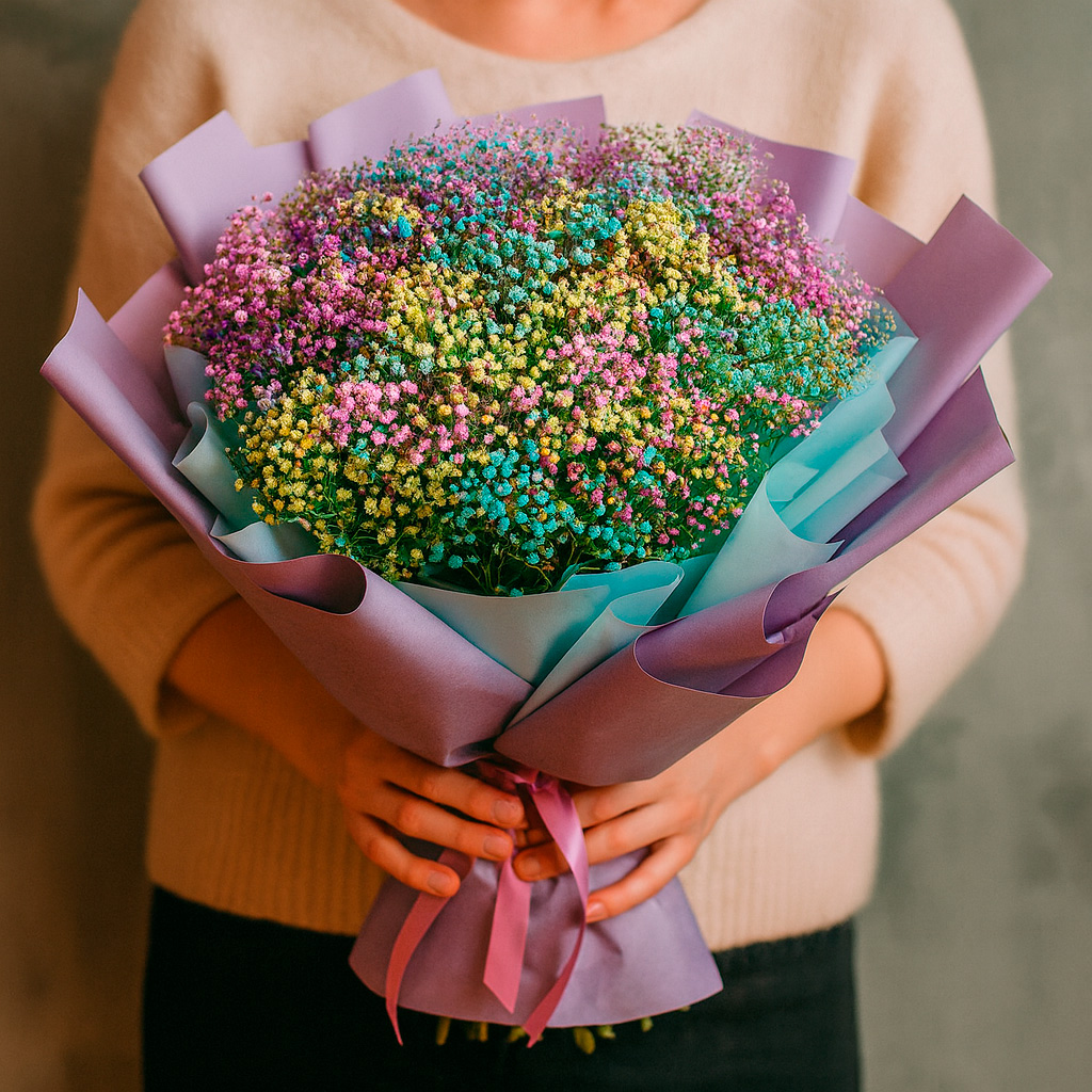 Яркий букет из разноцветной гипсофилы, сочетающий розовые, белые, голубые, жёлтые и зелёные оттенки, создаёт атмосферу праздника. Упакован в нежную матовую плёнку пастельных тонов и перевязан атласной лентой. Возможны альтернативы оформления: крафт-бумага или декоративная сетка. Прекрасный подарок для мамы на День матери или для любимой на 8 марта.