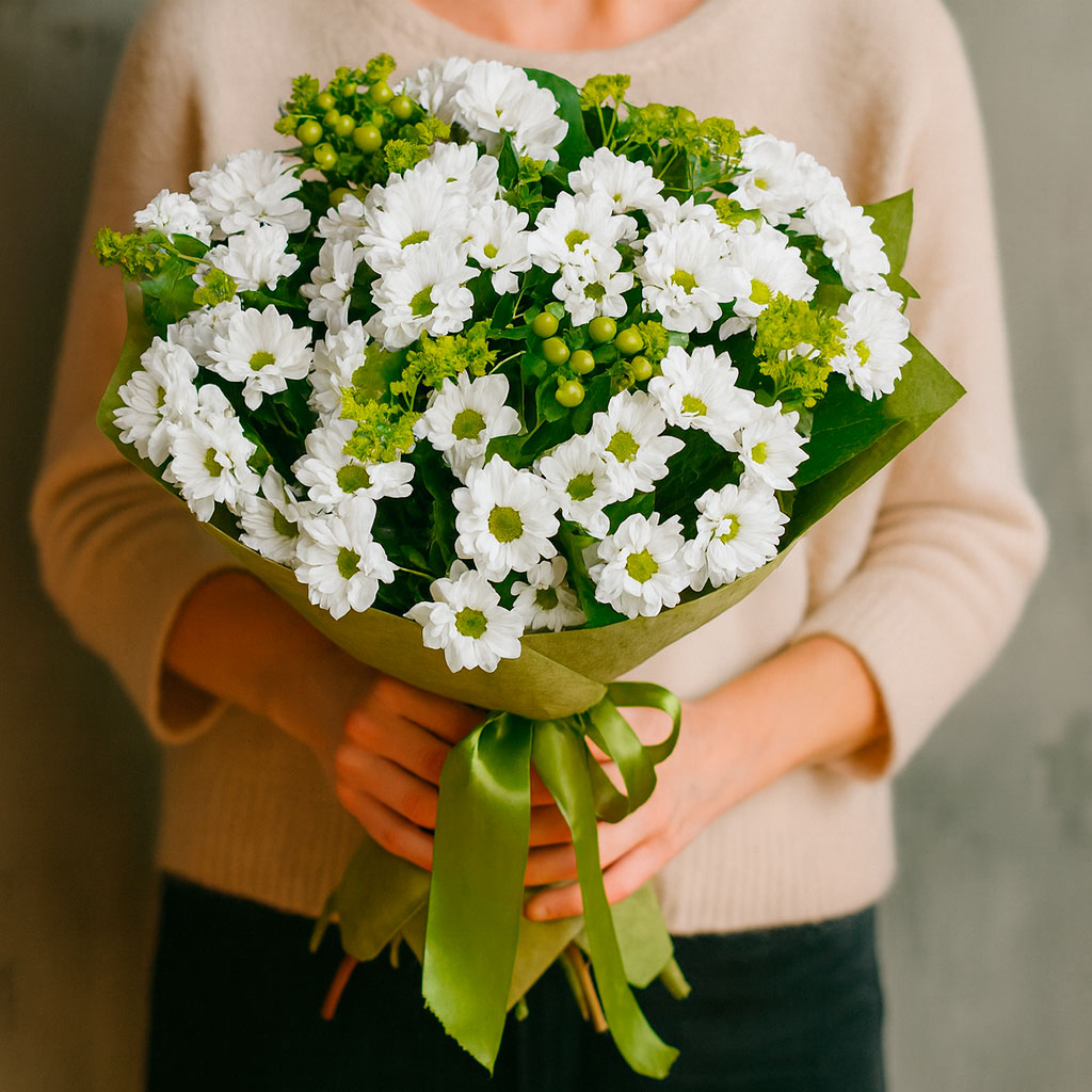 Белоснежные кустовые хризантемы в сочетании с ярким буплерумом и зелёным гиперикумом создают свежий и воздушный образ. Букет в зеленой бумаге и перевязан зелёной лентой, что подчёркивает его природную красоту. Возможны варианты оформления с матовой плёнкой или крафт-бумагой. Прекрасный подарок для жены на годовщину или для мамы на День матери.