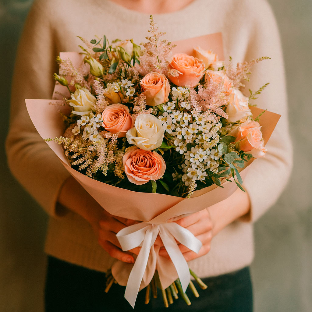 В этом изысканном букете сочетаются пудровые розы, кремовая эустома, нежный ваксфлауэр и воздушная астильба. Букет перевязан белой атласной лентой, что придаёт ему особую элегантность. Возможны варианты оформления с матовой плёнкой или декоративной сеткой. Прекрасный выбор для подарка на годовщину для любимой.