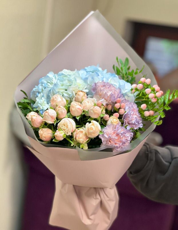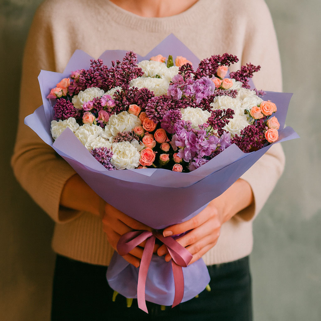 | Состав: | Маттиола, Розы, Гвоздики, Кустовые розы, Сирень |