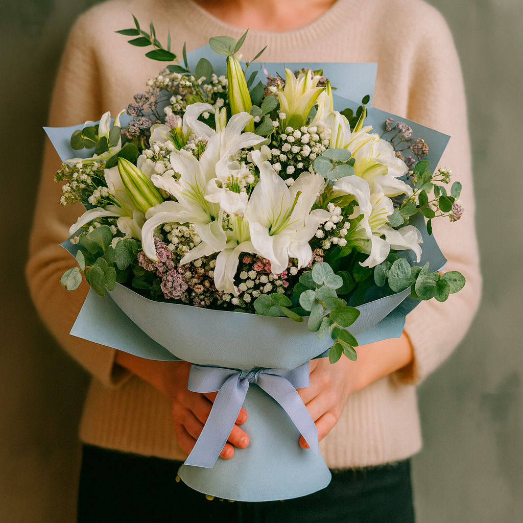 Белоснежные лилии, нежная гипсофила и свежий эвкалипт создают гармоничную композицию, наполненную легкостью и изяществом. Букет оформлен в матовую пленку голубого оттенка и перевязан атласной лентой. Возможны альтернативы оформления: крафт-бумага или декоративная сетка. Прекрасный выбор для поздравления на свадьбу или для любимой.