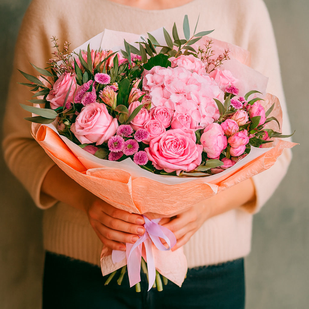 Розовая гортензия, розовые одноголовые розы и кустовые пионовидные розы, мини хризантемы и альстромерии создают нежную композицию с добавлением эвкалипта. Букет оформлен в матовую плёнку и перевязан атласной лентой. Возможна альтернатива с крафт-бумагой или декоративной сеткой. Подойдёт для поздравления любимой на день рождения или 8 марта.