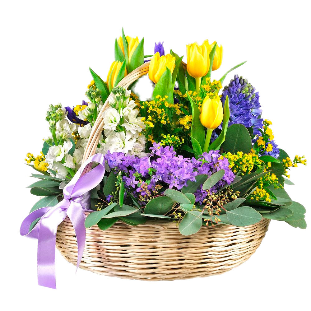 Яркая композиция из кампанулы, жёлтых тюльпанов, гиацинтов, белой маттиолы, солидаго, ирисов и эвкалипта создаёт атмосферу весеннего обновления. Корзина из лозы украшена нежной лавандовой лентой. Альтернативное оформление возможно в корзине с тканевой отделкой или из ротанга. Прекрасный подарок для мамы на День матери или на новоселье.