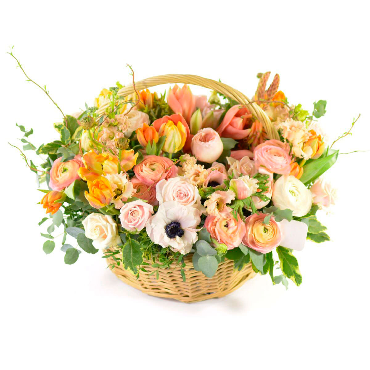 Белый анемон и кремовая эустома создают нежный акцент, а розовая кустовая роза и оранжевый тюльпан добавляют яркости. Плетёная корзина подчёркивает естественность композиции. Альтернативно можно использовать корзину из лозы или с тканевой отделкой. Подойдёт для поздравления на день рождения или для любимой.