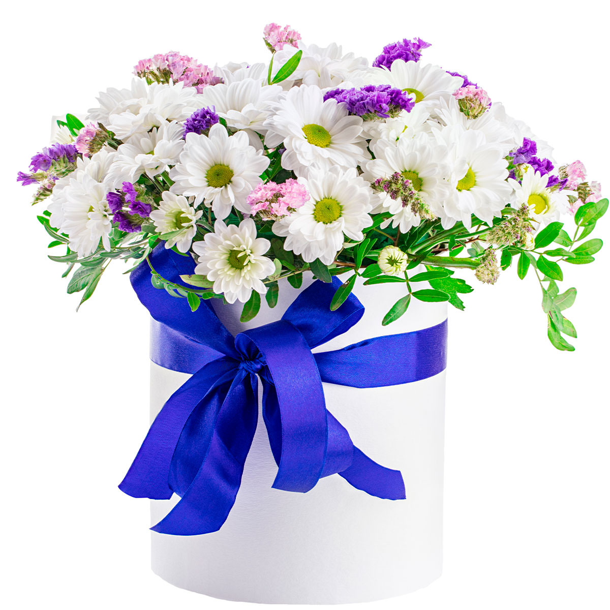 Белоснежные кустовые хризантемы в сочетании с розовой и фиолетовой статицей создают нежную и воздушную композицию. Шляпная коробка белого цвета украшена яркой синей лентой, подчеркивающей изысканность букета. Возможны варианты оформления в бархатной или атласной коробке. Прекрасный выбор для подарка на годовщину или для любимой.