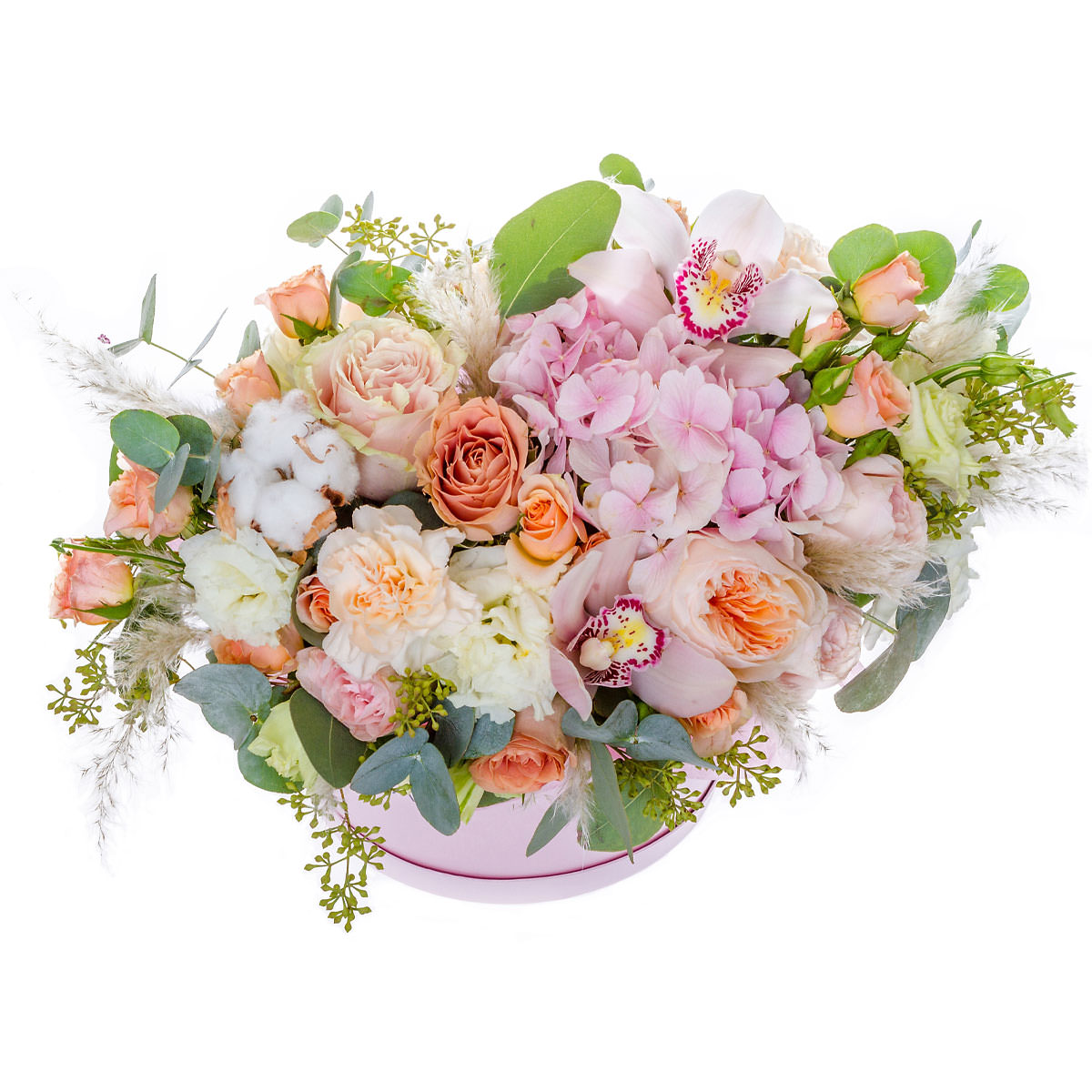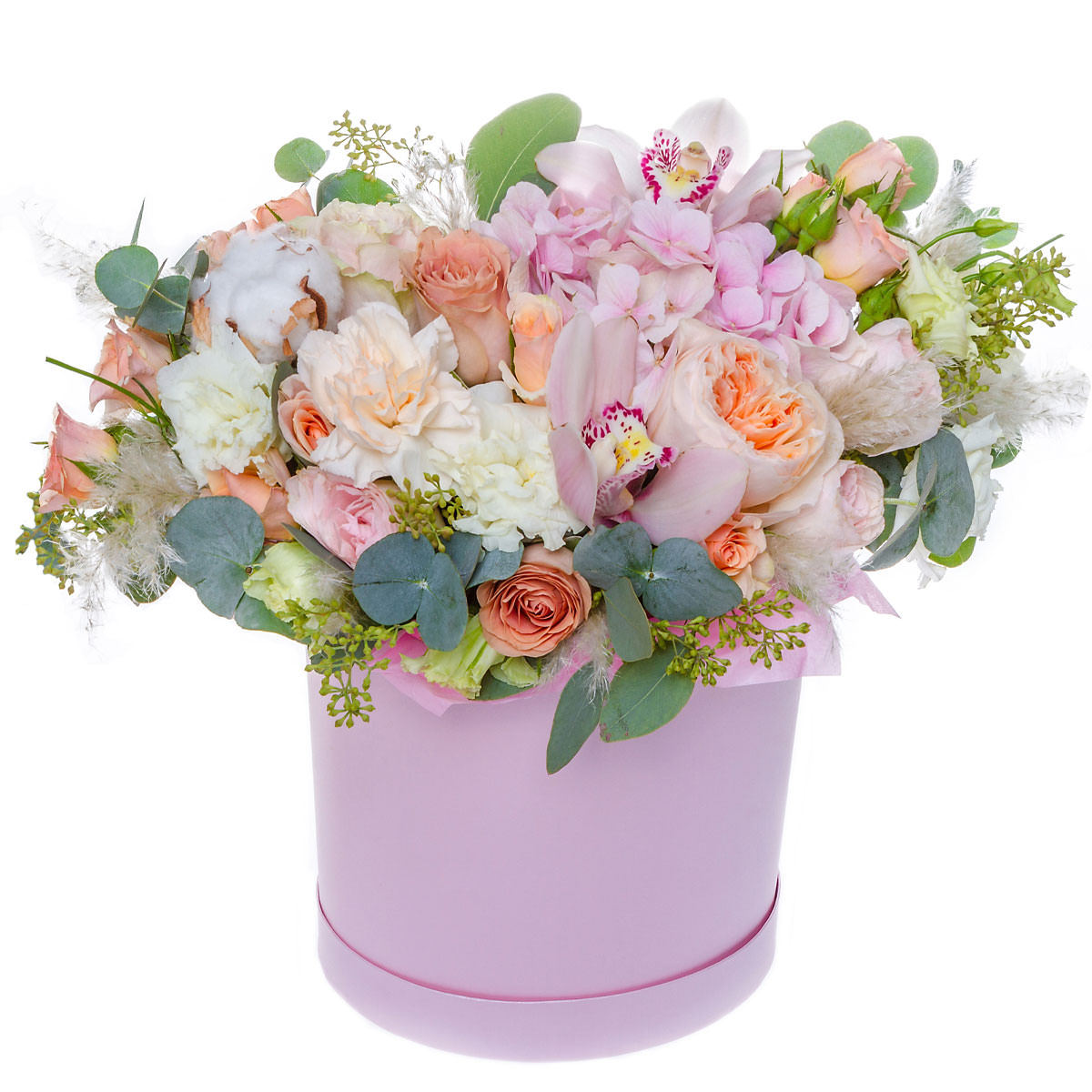 Розовая гортензия, персиковая пионовидная роза и розовая орхидея создают нежную палитру, дополненную кремовой гвоздикой и белой эустомой. Сухоцвет и эвкалипт придают композиции изысканность. Цветы оформлены в элегантной розовой шляпной коробке. Возможны варианты оформления в бархатной или атласной коробке. Прекрасный подарок для любимой на годовщину или день рождения.