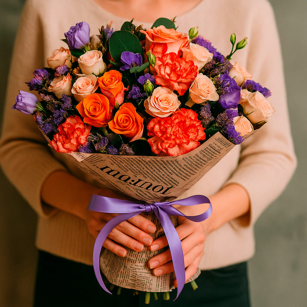 Роскошное сочетание оранжевых роз, бело-красных гвоздик, фиолетовых эустом и кремовых кустовых роз создаёт яркий и запоминающийся образ. Букет оформлен в крафт-бумагу и перевязан лавандовой лентой. Альтернативно можно использовать матовую плёнку или декоративную сетку. Прекрасный выбор для любимой на день рождения или на 8 марта.