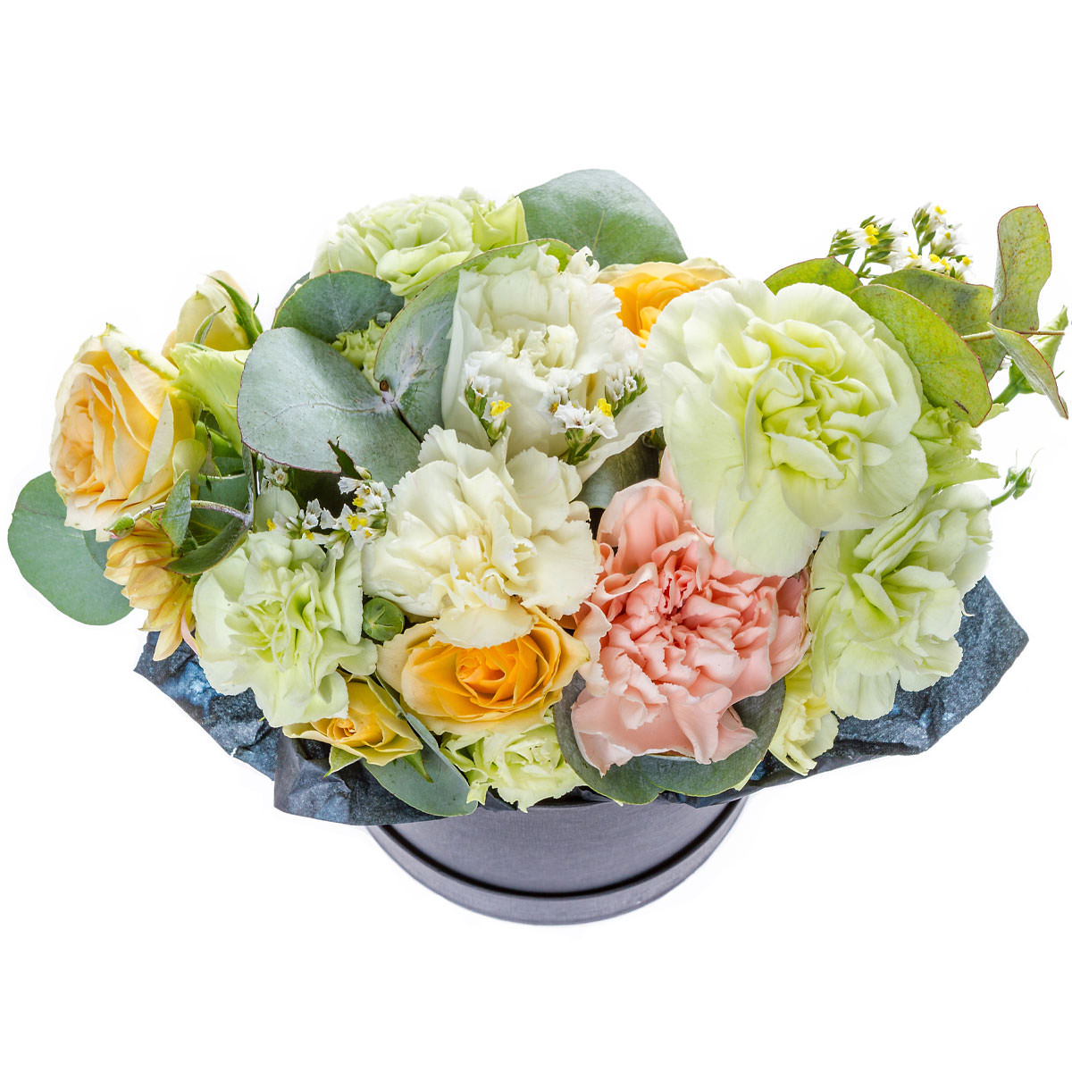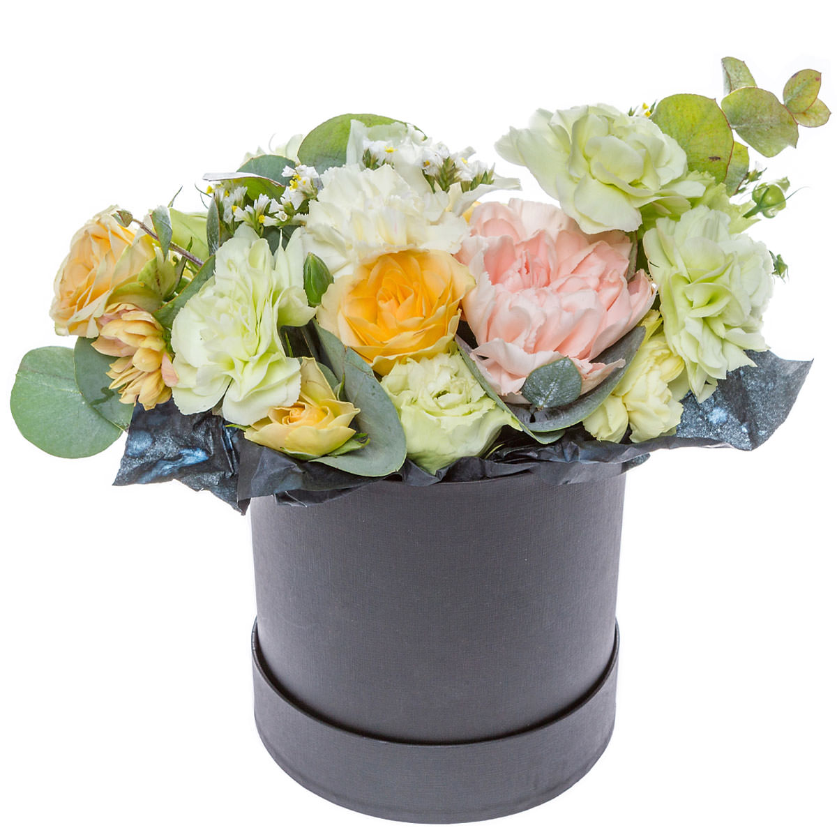 Яркие розы кустовые, нежные розовые пионы и бело-зеленые гвоздики создают удивительную гармонию в этой цветочной композиции. Белая эустома и персиковая хризантема добавляют легкости и воздушности, а эвкалипт и статица завершают образ. Композиция оформлена в элегантной черной шляпной коробке. Возможны альтернативы оформления в бархатной или атласной коробке. Прекрасный подарок для любимой на день рождения или годовщину.