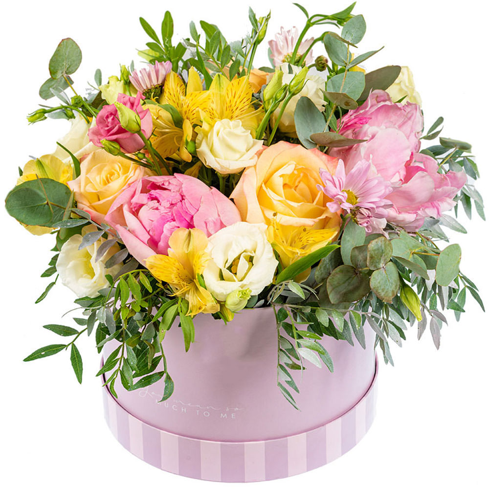 Яркие розовые пионы, желтые розы и альстромерии, белоснежные эустомы и сиреневые хризантемы создают гармоничную композицию, дополненную зеленью самшита и эвкалипта. Цветы оформлены в элегантной шляпной коробке нежного розового цвета. Возможны варианты оформления в бархатной или атласной коробке. Прекрасный подарок для любимой на день рождения или годовщину.